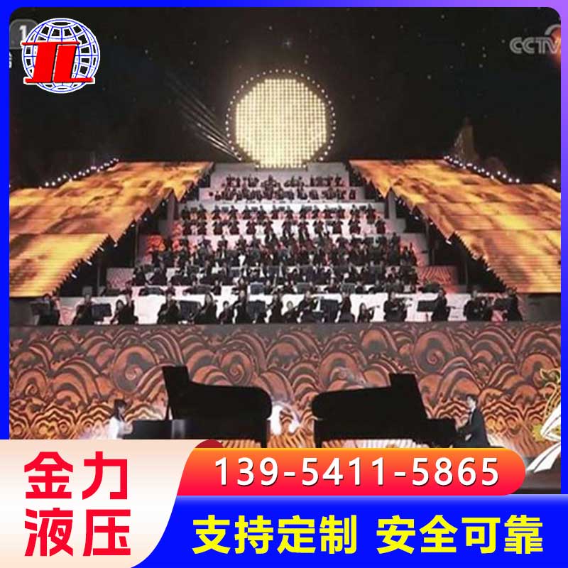 液压升降舞台可实现双层台面的升降。可根据需要亦可拼成阶梯形、多景、多层次阶梯,组成升降台群,能在行程范围内组成不同的台阶,丰富舞台多功能效果伸缩舞台适应于、会堂、影剧院、多功能厅、演播厅、文化体育场馆等的设备,伸缩舞台采用有效的导向系统,使伸缩台在平移过程中与固定台的间隙小,运行平稳、速度无级变化、同步装置、电动采用低速大扭距驱动装置,伸缩过程中绝对平行、自如、伸缩到位、可自动实现补平旋转舞台有升降、旋转、倾斜等多种功能,控制采用自锁、互锁、行程开关、机械限位、液压防爆等保护措施。使舞台安全、平稳可靠,广泛应用于会堂、影剧院、多功能厅、演播厅、文化体育场馆、酒店等文化娱乐场所。
